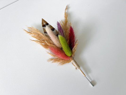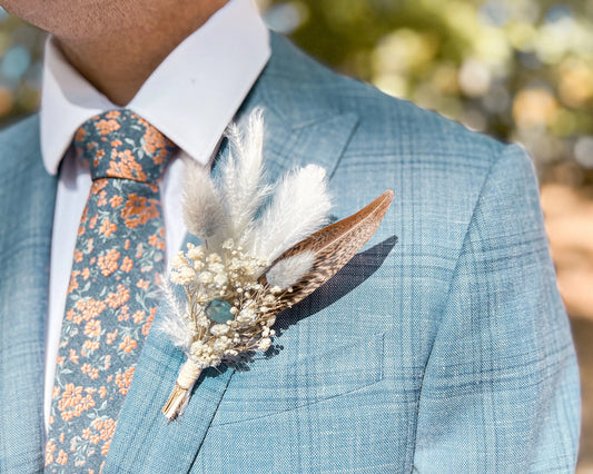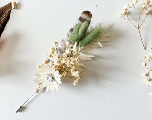 Sage Green Boutonnière, Boho Wedding Dried Flowers, Ruscus, Baby's Breath, Bunny Tails, Strawflower, Pheasant Feather