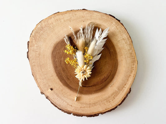 Wedding Boho Boutonniere, Yellow, Neutral, Dried Flowers, Pampas Grass, Strawflower, One of a kind, Groom