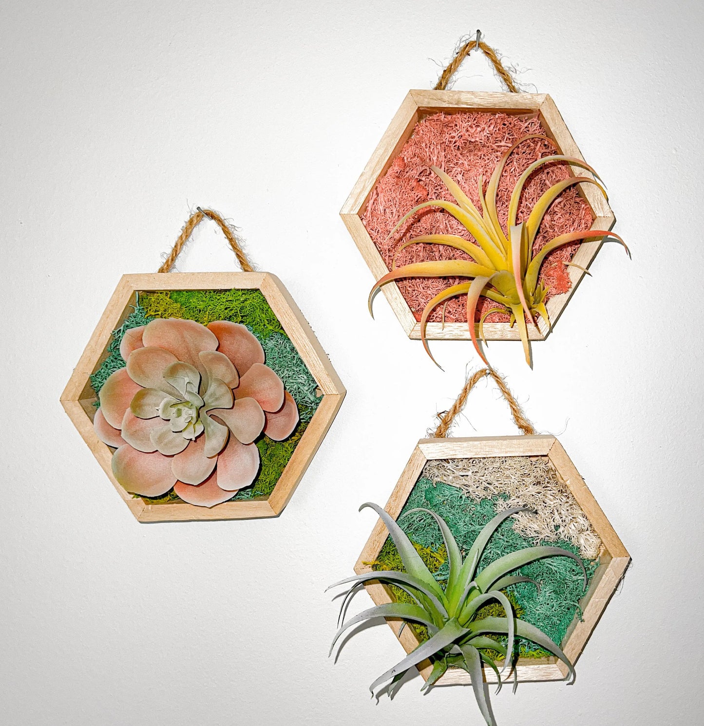 Materials: Preserved Reindeer Moss,Natural Wood Frame,Unfinished,Hexagon,Honeycomb,Twine,Hanging Hardware,Green Moss,Colorful Moss,White Moss